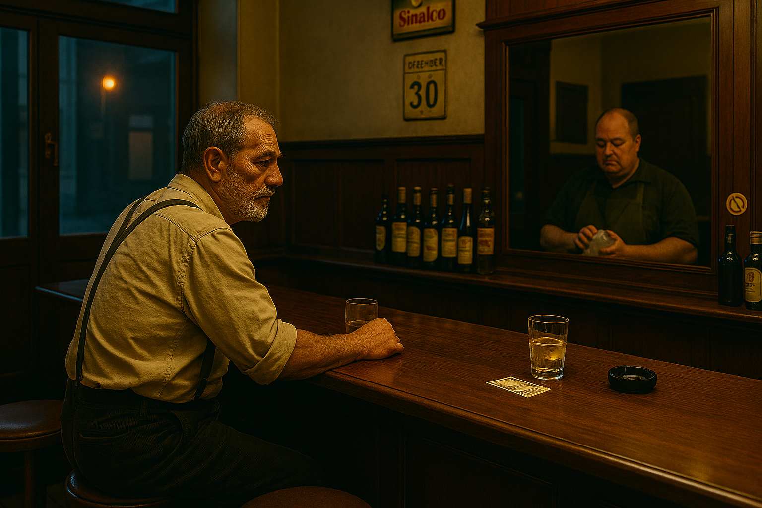 Kaltenbach saß an der Theke, als der Mann hereinkam. Anzug, kein Schlips, das Jackett offen. Start-up oder Agentur. Einer von diesen. Man sieht es am Gang. An der Art, wie sie einen Raum betreten, als gehörte er ihnen. Als wartete jemand auf sie. Der Mann bestellte einen Gin Tonic, dann zog er sein Handy und begann zu tippen. Die Lippen bewegten sich beim Schreiben. Manche Menschen lesen sich selbst vor, was sie tippen. Kaltenbach hatte das nie verstanden. Wer sich selbst vorlesen muss, traut seinem eigenen Denken nicht. Oder er hat keines.